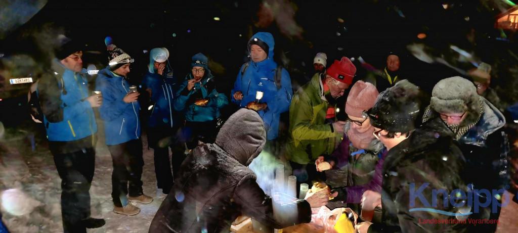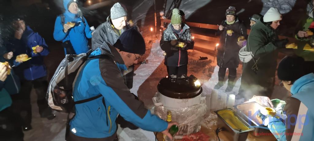 Das Wetter hätte nicht besser mitspielen können – es war wirklich ein unglaublich schöner Winterabend. Nach einer gut einstündigen Rundwanderung mit Übungsleiter Peter Juffinger wurden alle von Marion Bitschnau und Sabine Bickel mit einer warmen Gulasch- und/oder Kürbissuppe im Brotteig und warmen Getränken empfangen, was bei den kühlen Temperaturen eine Wohltat war.