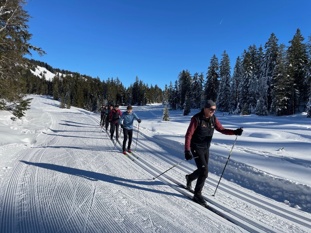 An drei intensiven Kurstagen, verteilt über den Winter, lernten die Teilnehmer weit mehr als nur Wandern auf Skiern. Am ersten Tag auf dem Bödele, bei erschwerten und eisigen Verhältnissen standen Materialkunde und erste Gleitversuche in der Ebene auf dem Programm. Über Weihnachten konnten die Teilnehmer das erlernte üben bevor in der zweiten Einheit, Schulung des Gleichgewichtes, Stockeinsatz, Beinabdruck und effiziente Fortbewegung sowie richtiges Bremsen und das bewältigen kleinerer Anstiege das Übungsziel war. Zum Abschluss ging es über traumhafte Loipen ins Grenzgebiet, bevor in der Moosalpe auf das Erlernte gebührend angestoßen wurde.