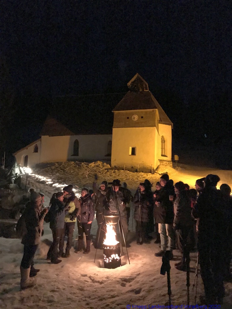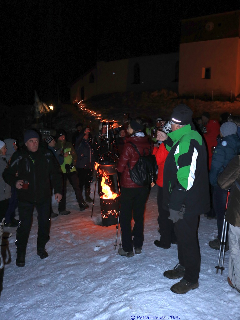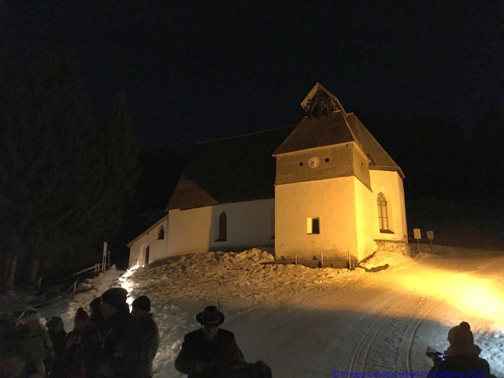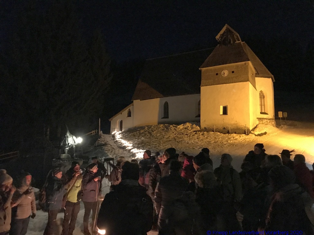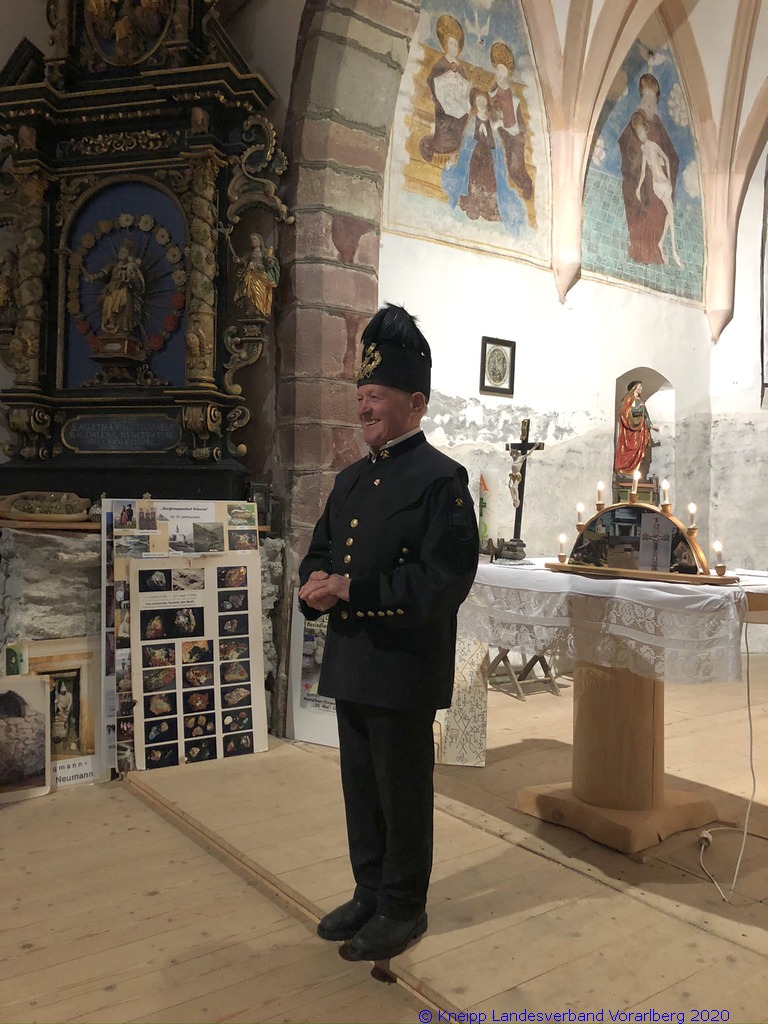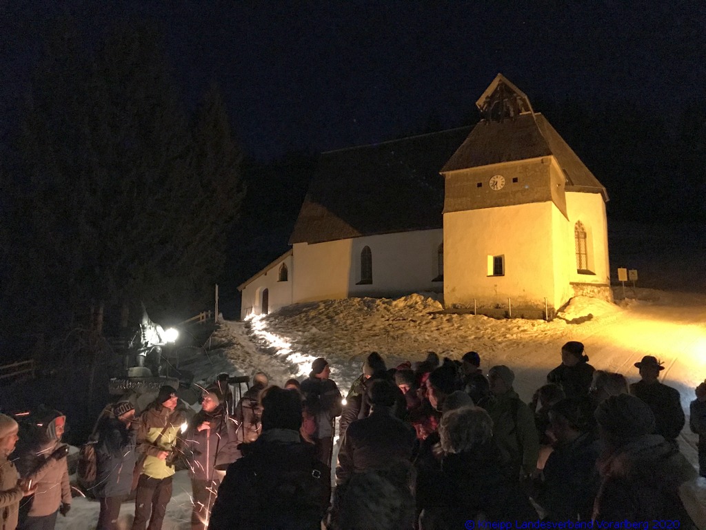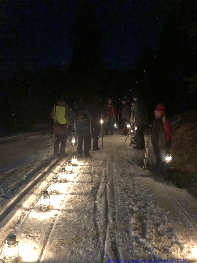 Gestärkt und mit Laternen ausgestattet, setzten wir unseren Weg durch die sternenklare Nacht fort. Unser Ziel war die Knappen-Kapelle. Dort erwartete uns Alfons in historischer Bergmannsuniform. Er erzählte uns viele interessante Fakten über die Bergmannschaft und den Bergbau im Silbertal.