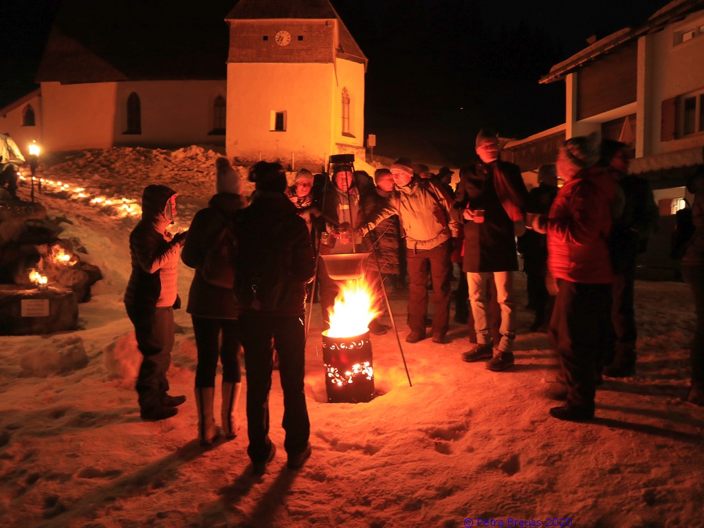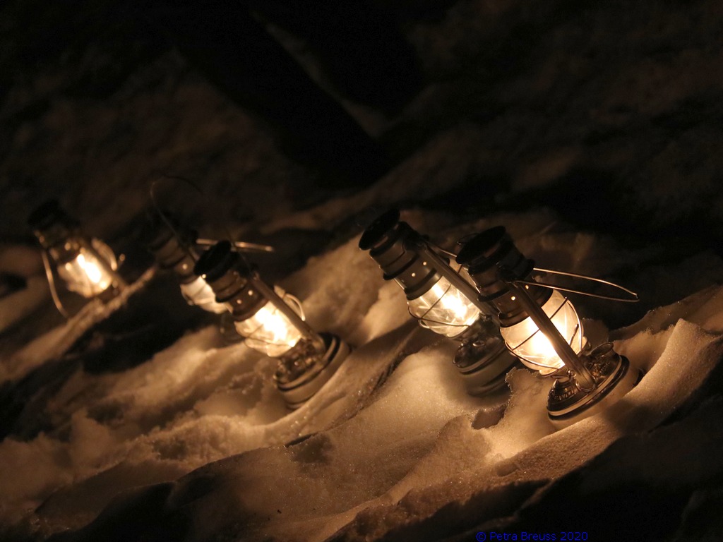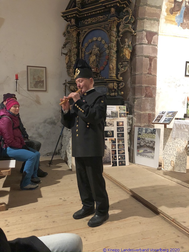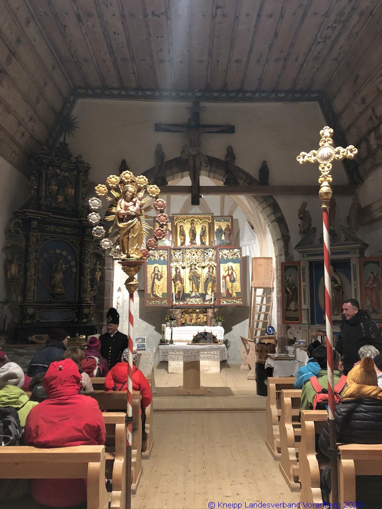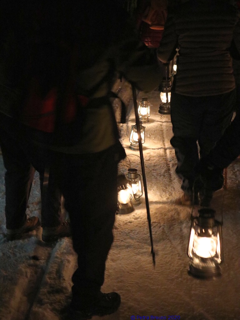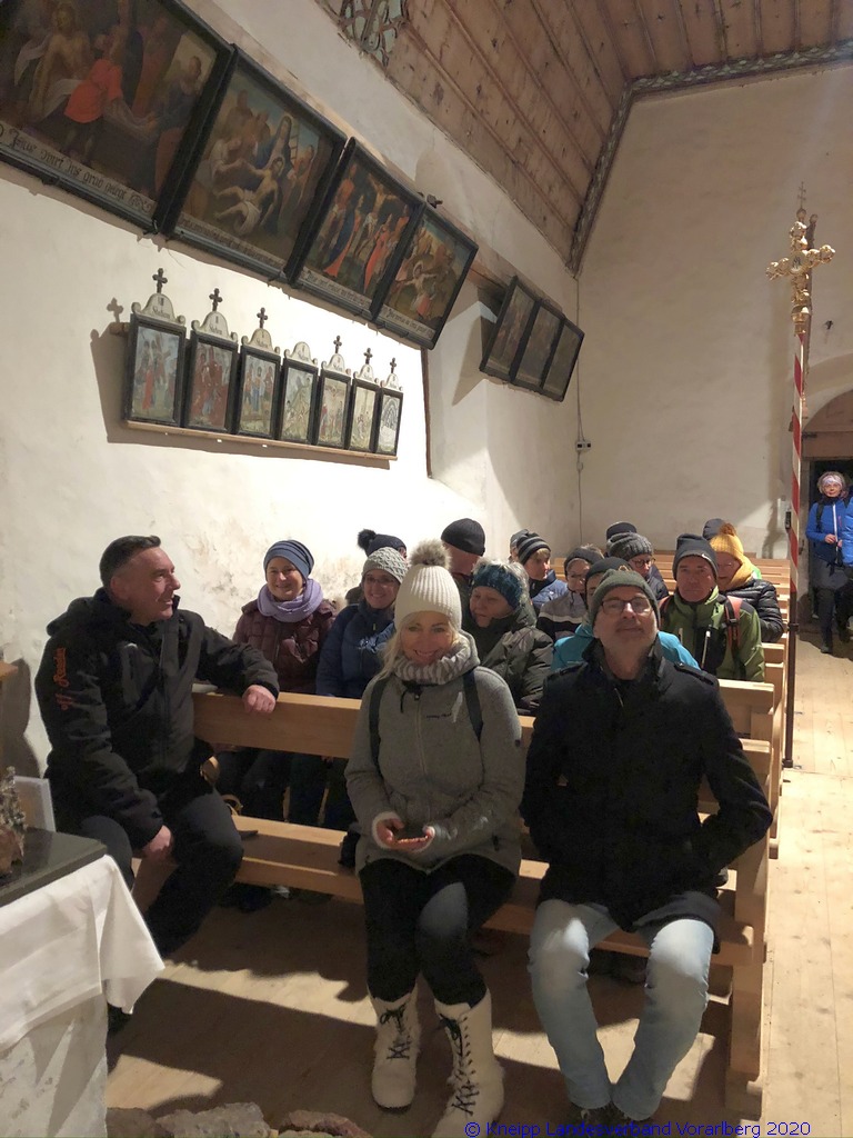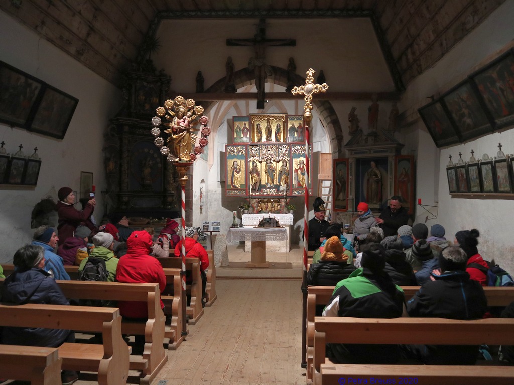 Gestärkt und mit Laternen ausgestattet, setzten wir unseren Weg durch die sternenklare Nacht fort. Unser Ziel war die Knappen-Kapelle. Dort erwartete uns Alfons in historischer Bergmannsuniform. Er erzählte uns viele interessante Fakten über die Bergmannschaft und den Bergbau im Silbertal.