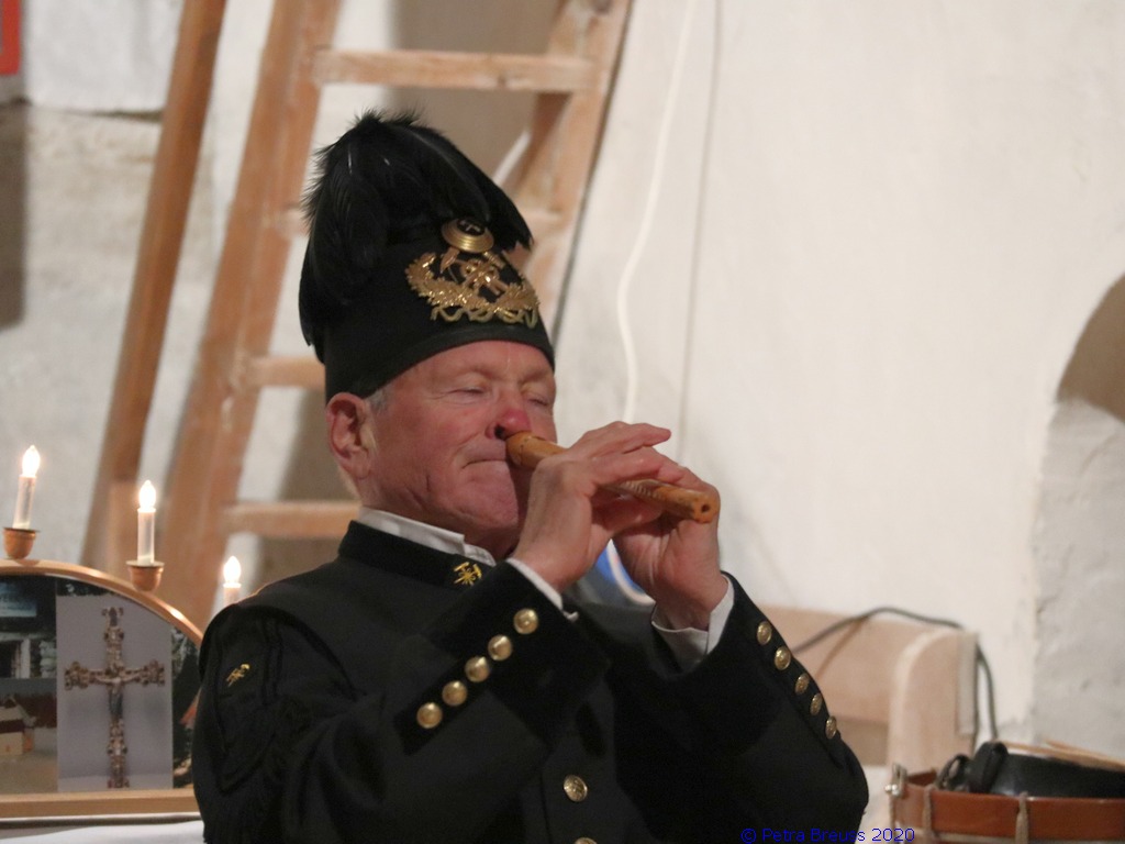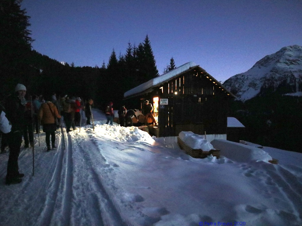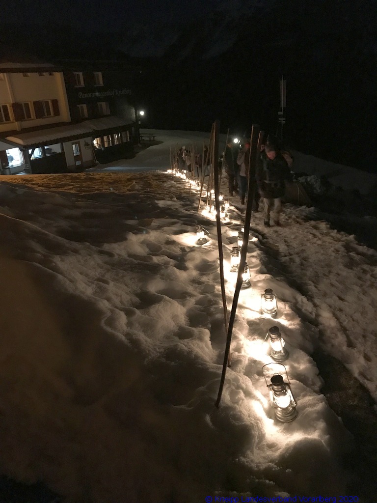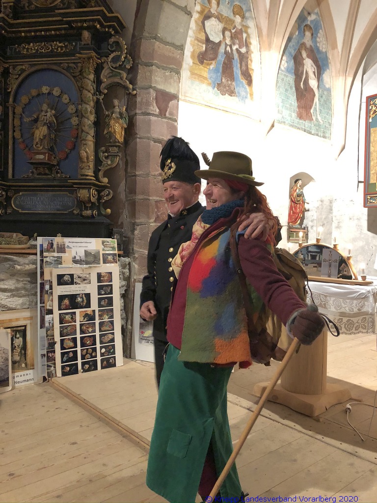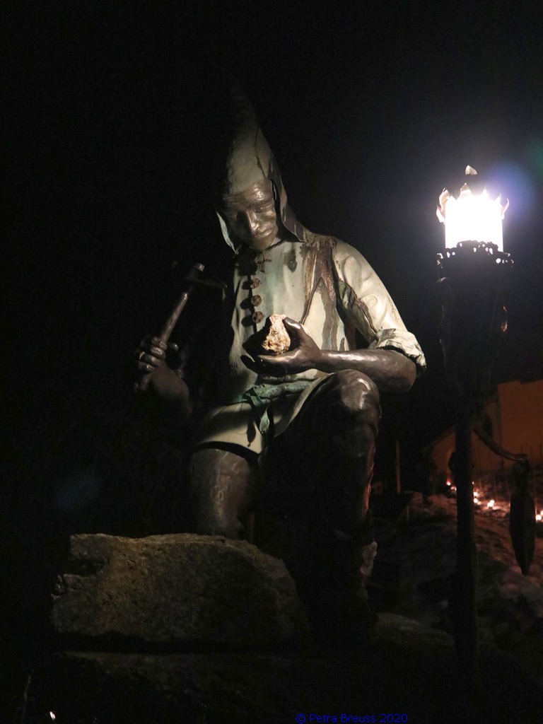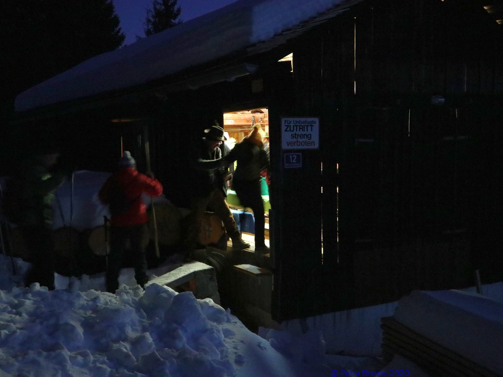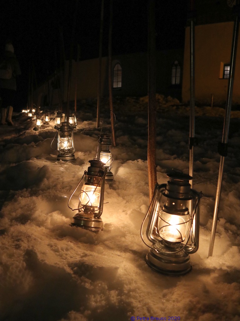Gestärkt und mit Laternen ausgestattet, setzten wir unseren Weg durch die sternenklare Nacht fort. Unser Ziel war die Knappen-Kapelle. Dort erwartete uns Alfons in historischer Bergmannsuniform. Er erzählte uns viele interessante Fakten über die Bergmannschaft und den Bergbau im Silbertal.
