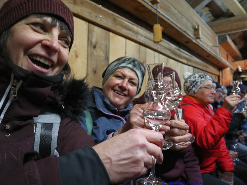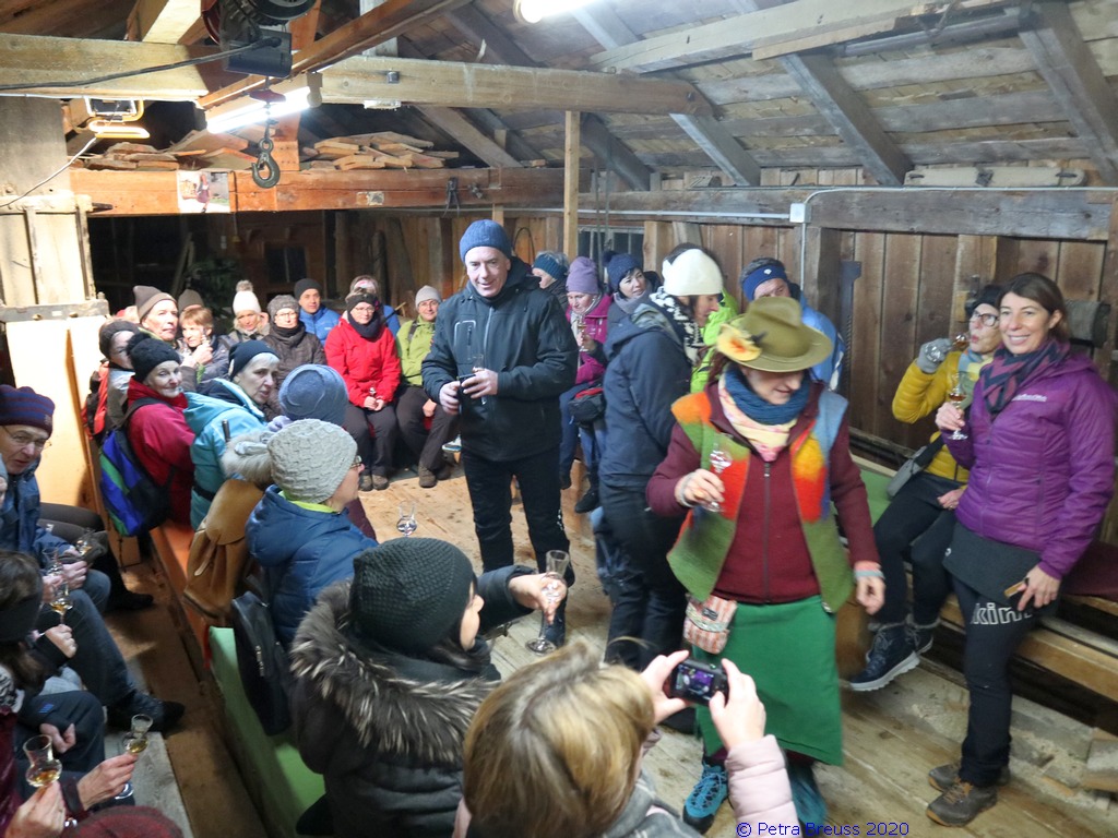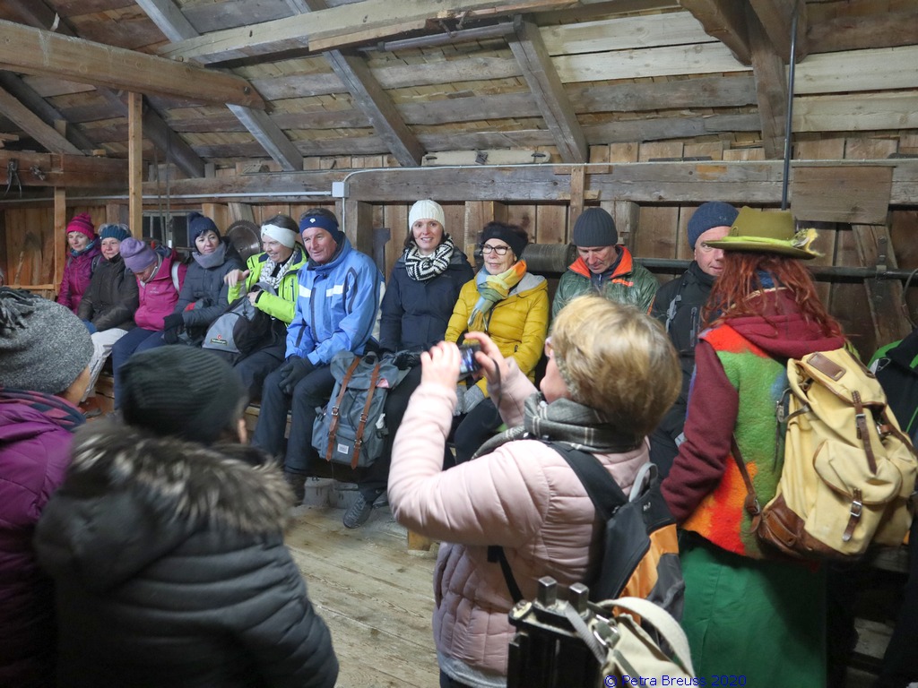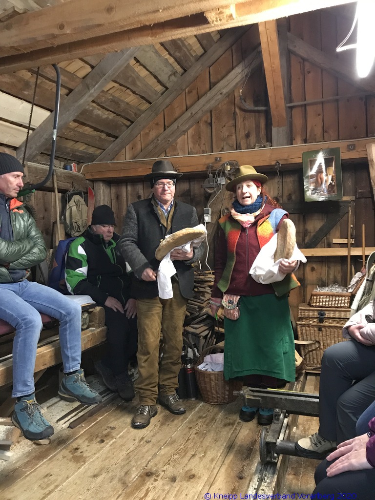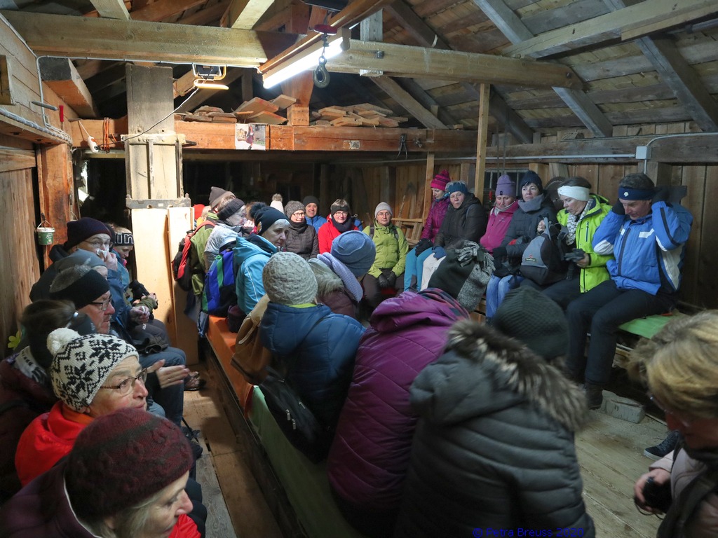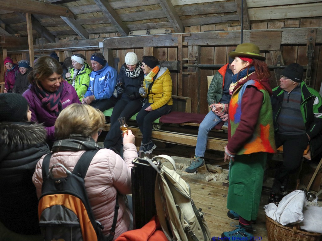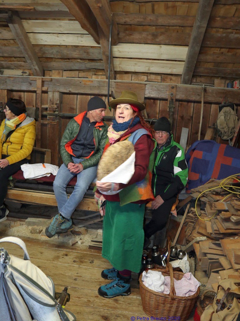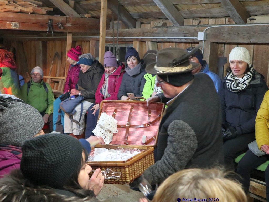 Auf einem wunderschönen Winterwanderweg mit herrlichem Panoramaausblick wanderten wir zur alten Säge. Zur Erhaltung der Gesundheit gab es selbstgemachten Enzian- und Salbeischnaps. Diese Stärkung war willkommen, bevor Hertha und Roland frisch gebackenes Holzofenbrot von Pauline mit uns teilten.