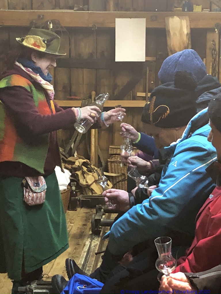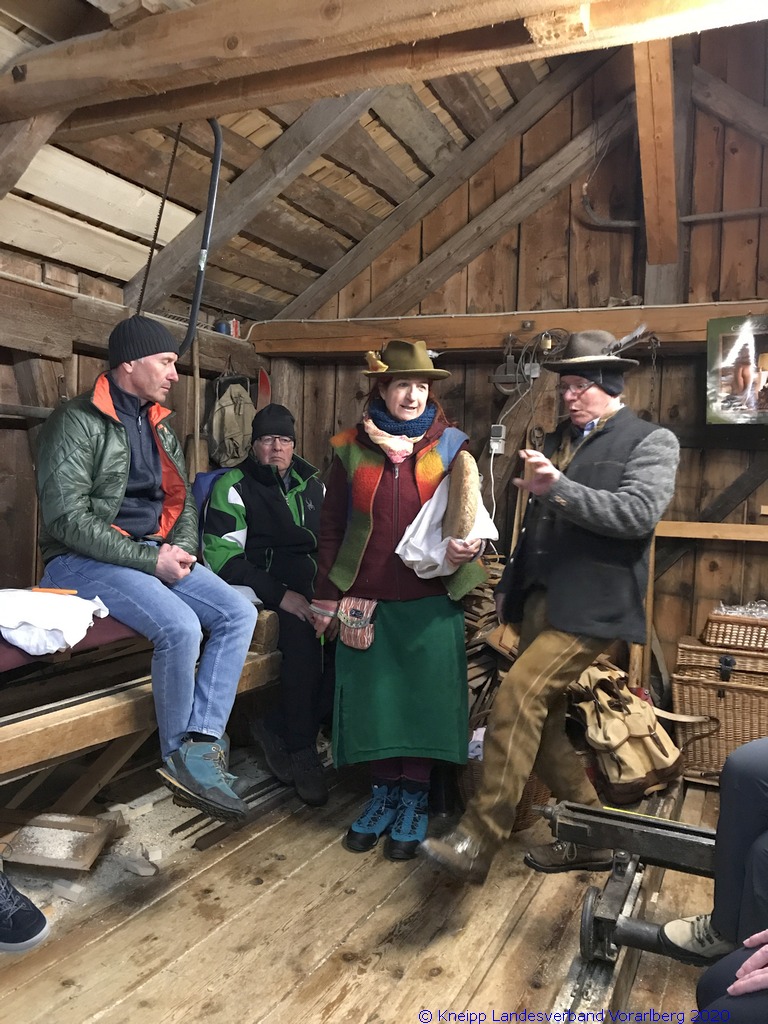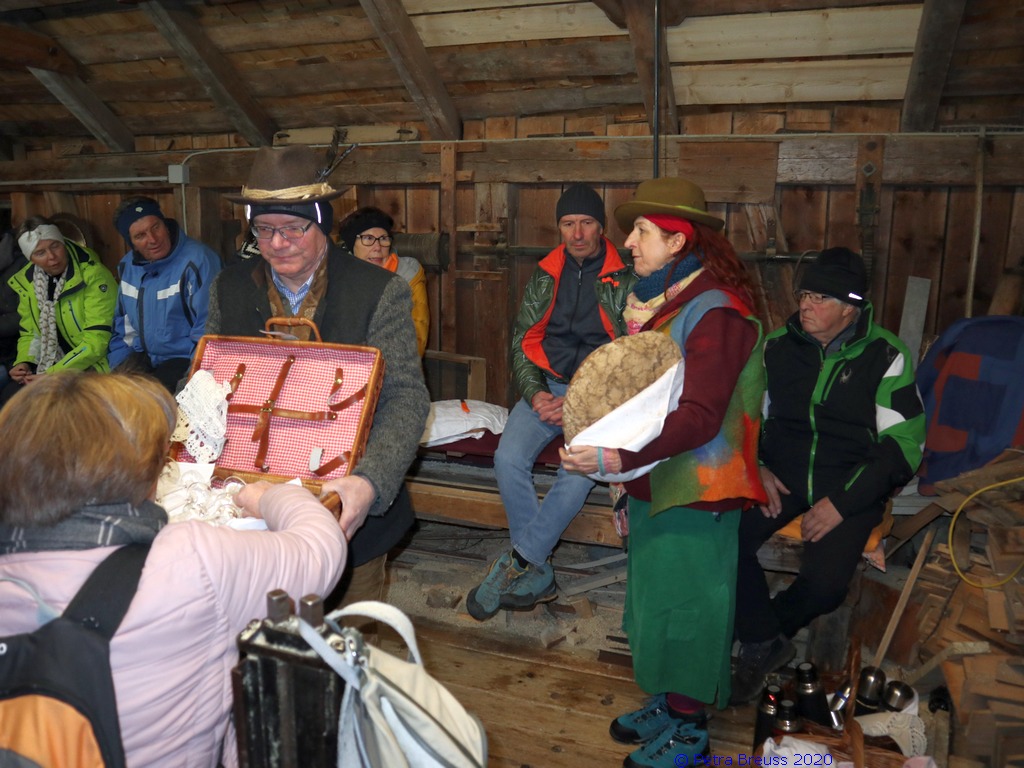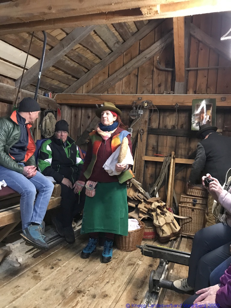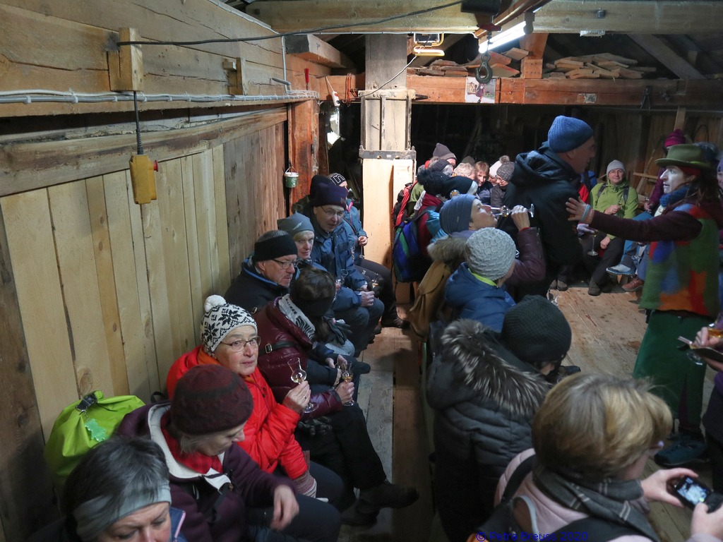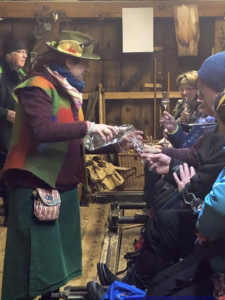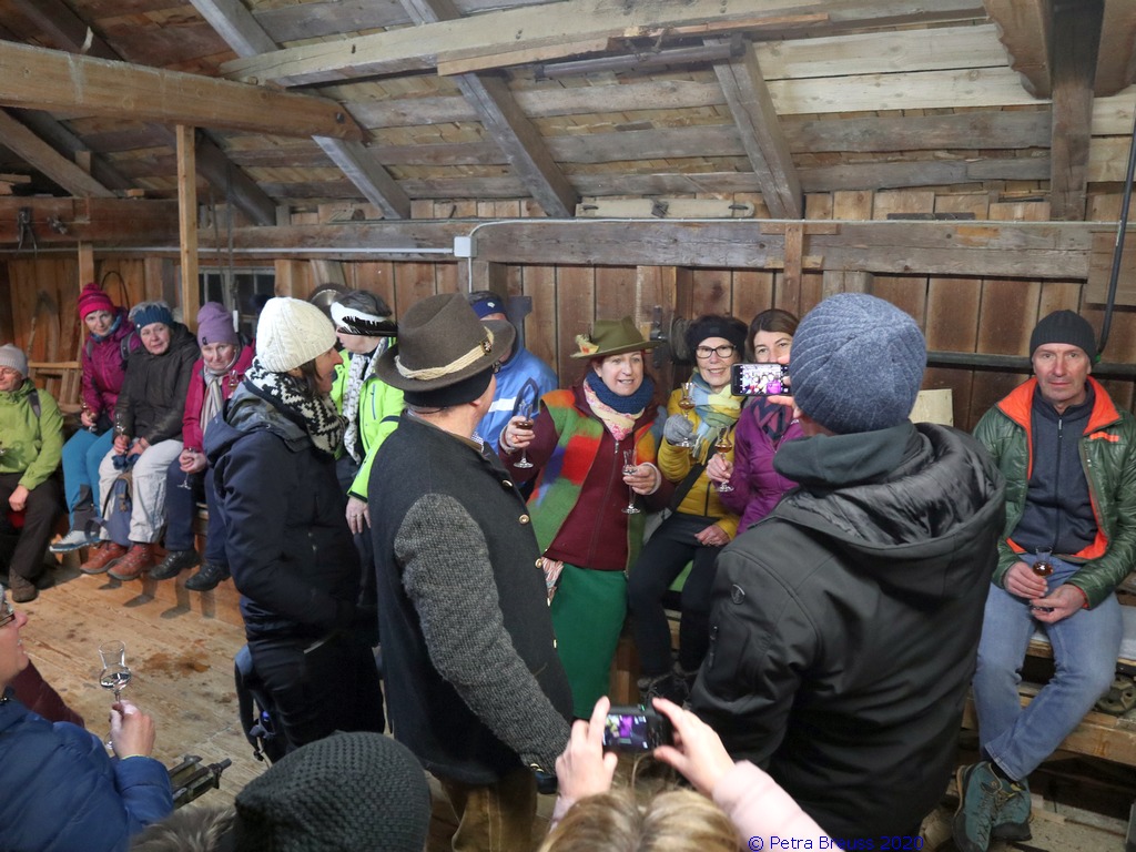 Auf einem wunderschönen Winterwanderweg mit herrlichem Panoramaausblick wanderten wir zur alten Säge. Zur Erhaltung der Gesundheit gab es selbstgemachten Enzian- und Salbeischnaps. Diese Stärkung war willkommen, bevor Hertha und Roland frisch gebackenes Holzofenbrot von Pauline mit uns teilten.