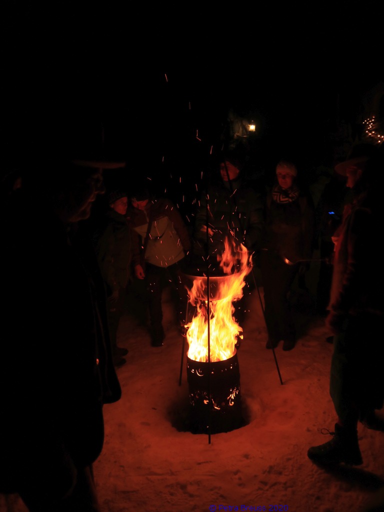 Nach dem Verlassen der Knappen-Kapelle wurden wir vor dem Panorama-Gasthaus von einem Lagerfeuer und auf dem Dreibein zubereitetem Glühwein empfangen. Hier durften wir ein leckeres Sagenmenü genießen. Die Atmosphäre war magisch, und die Geschichten und Sagen, die wir hörten, machten den Abend unvergesslich.